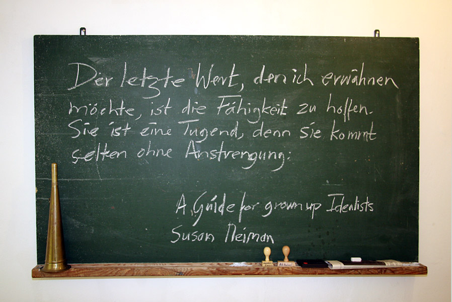 The quotes on the blackboard changed throughout the exhibition and the visitors were invited to participate through adding their own thoughts or ideas and chosing leaflets with quotes on migration and "free passes to the world" to take home.